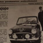 Erkki Rautiainen poseeraa lehtikuvassa Mini Cooperin vieressä ja hymyilee. Kuvan viereen, Kotiseutu-uutisten etusivulle painettu otsikko kertoo, miksi syytä hymyyn on: “Erkki Rautiainen jo kova ajaja”.