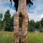 Rääkkylä-Seuran puheenjohtaja Erja Mooren kotipihassa kohoaa noin 1000 kiloinen taideteos. Maitohorsmien lävitse polku vie ylösalaisin käännetyn kaksihaaraisen puun luo. Kuorittu puunrunko muistuttaa metsästä tallustaneen jättiläisen jalkoja.