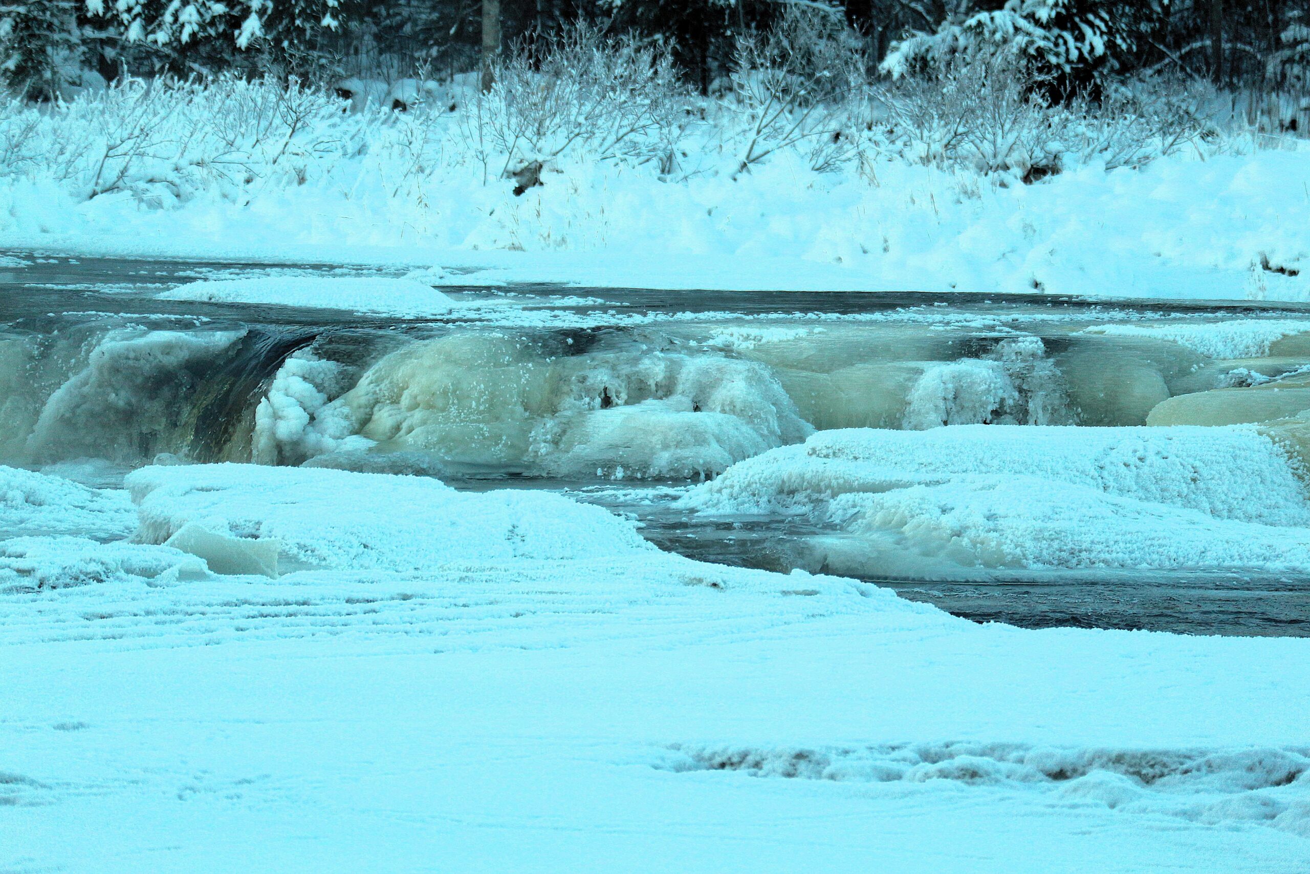 Siikakoskeen on muodostunut hyydepato alkuvuoden napakoiden pakkasten aikana. Kuva: Mirja Parviainen